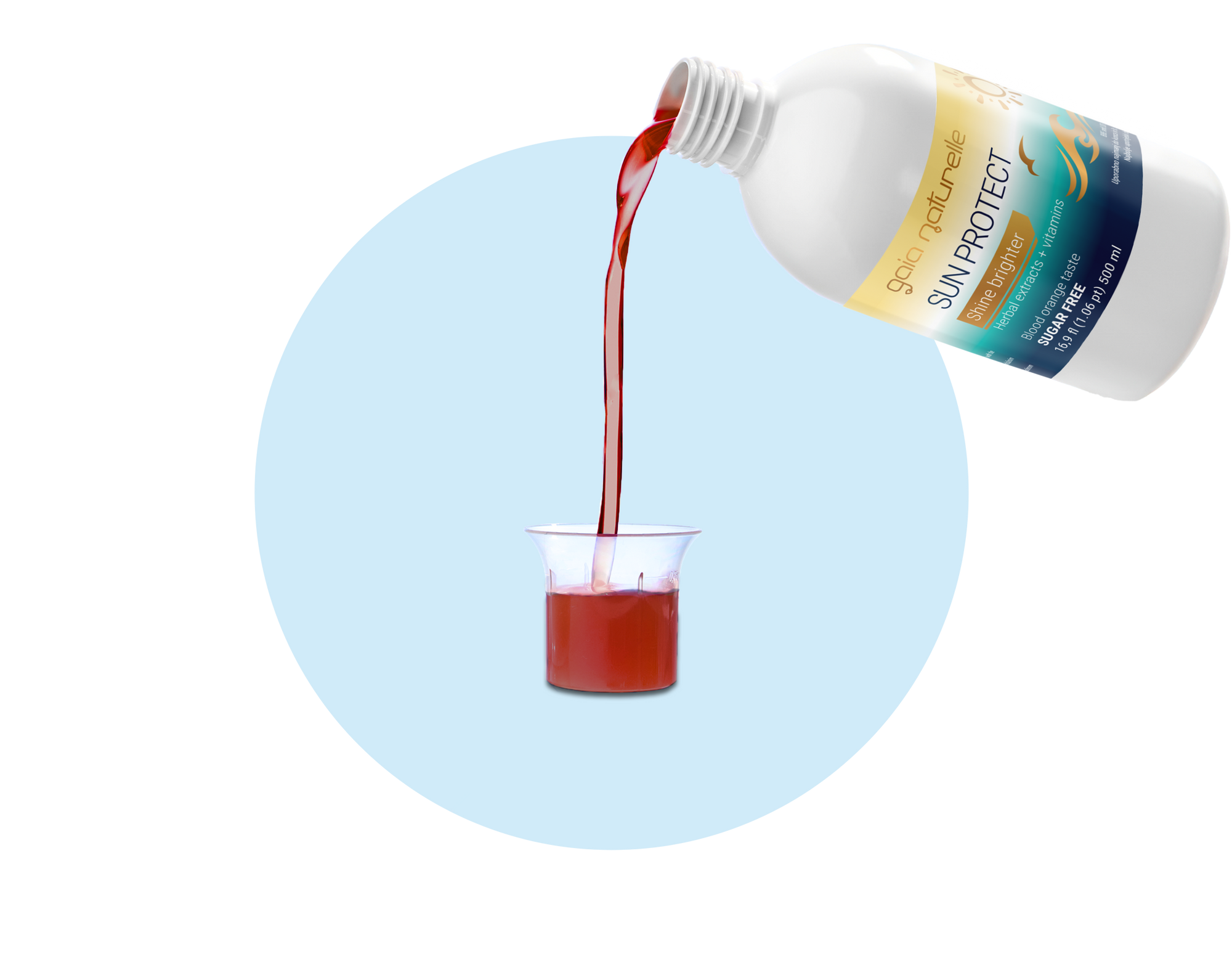 Sun Protect ist ein flüssiges Nahrungsergänzungsmittel mit pflanzlichen Extrakten und Vitaminen, das die Haut vor äußeren Einflüssen schützt.